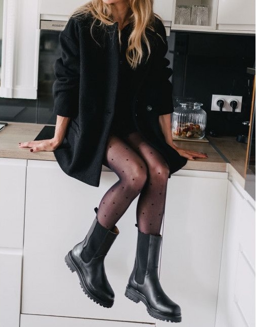 Collant à poids + chemise noire oversize + manteau mi-long noir + Chelsea noires hautes