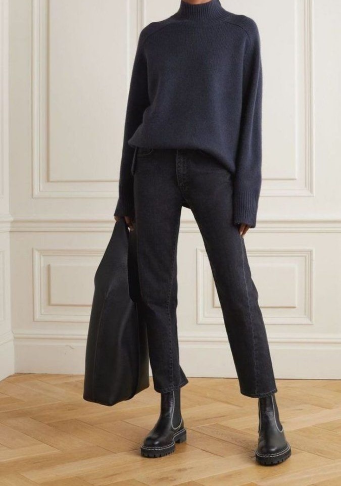 Jean droit noir + pull col roulé bleu marine+ manteau long + Chelsea noires