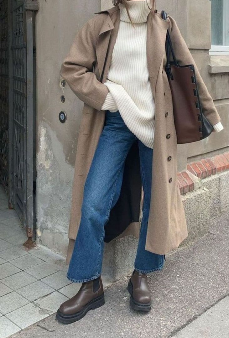 Jean droit bleu + pull oversize blanc + trench beige long + Chelsea beiges ou marrons