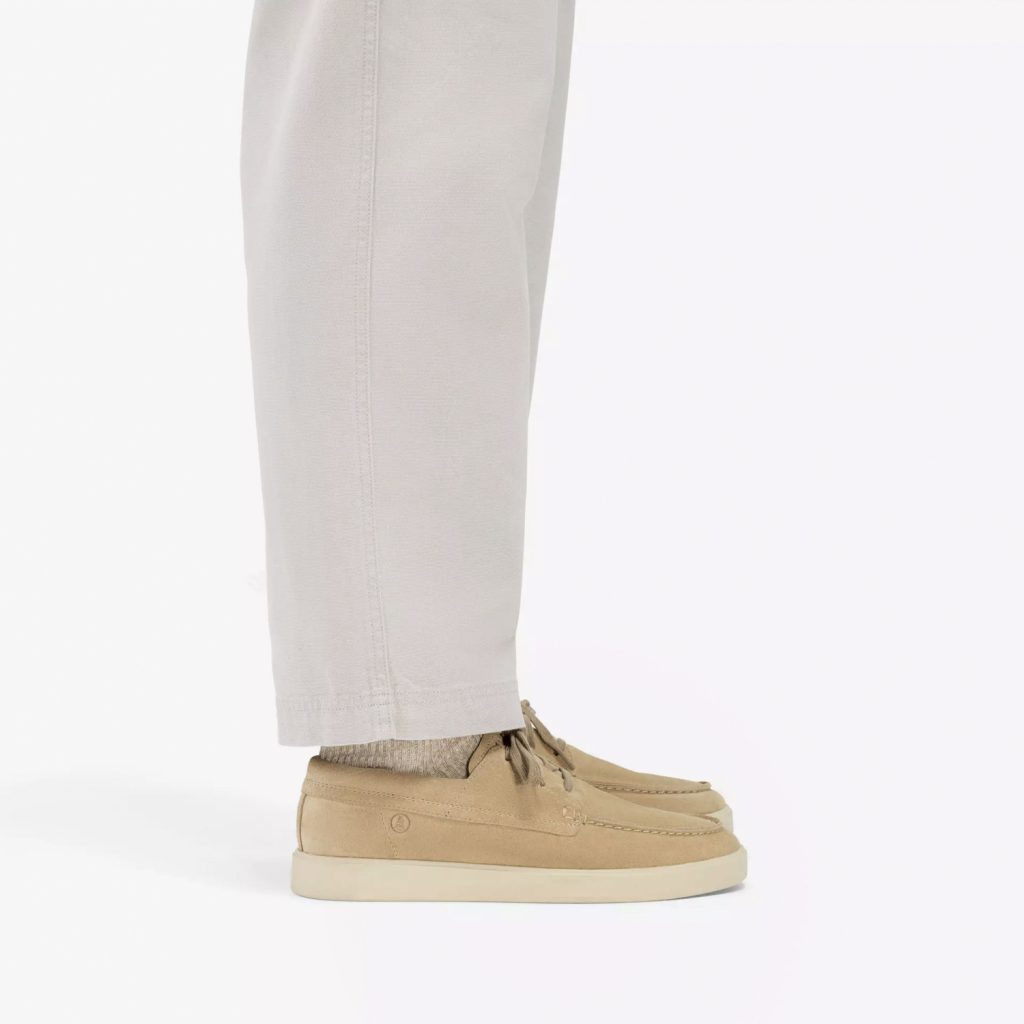 Pour lui, les mocassins Aldwin Step en tan se portent pieds nus avec un chino écru et une chemise en lin bleu ciel pour un esprit riviera décontracté. Les derbies Paulton Lace noirs structurent une tenue de travail moderne : pantalon de costume marine, chemise blanche et pull col V gris chiné. La Lockford Boat en daim sand sublime un look week-end avec bermuda beige et polo blanc. Enfin, la Wallabee Evo s’accorde parfaitement avec un jean selvedge et une veste en velours côtelé pour un style rétro assumé.