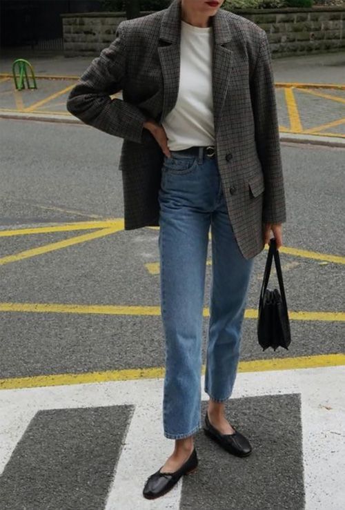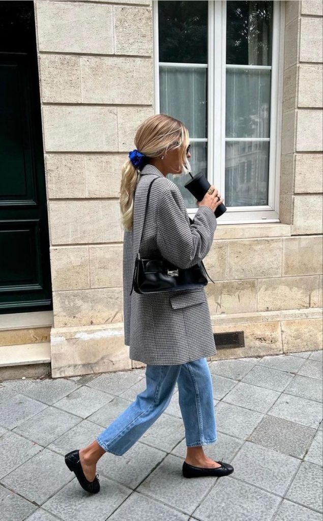 C’est probablement la combinaison la plus efficace du moment, et pourtant elle reste sous-estimée. Un jean droit — brut, lavé clair, ou blanc selon la saison — associé à un blazer ajusté et une ballerine à bout pointu : le résultat est net, élégant, sans effort apparent.