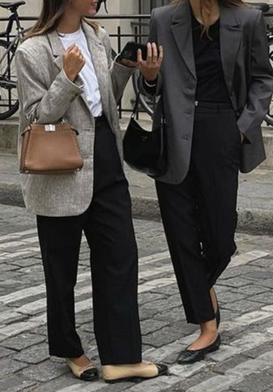 C’est le combo le plus inattendu — et souvent le plus réussi. Un pantalon large à taille haute, ou un tailleur pantalon un peu oversize, associé à une ballerine fine : la légèreté de la chaussure équilibre le volume du bas. La silhouette devient graphique, moderne, presque architecturale.
