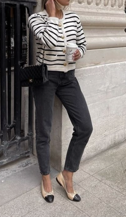 Ce look joue sur le contraste entre la décontraction du jean et la précision de la ballerine. L’œil est attiré vers le bas, la silhouette s’allonge naturellement. C’est le genre de tenue qu’on met le matin sans trop réfléchir et qui donne l’impression d’avoir tout prévu.