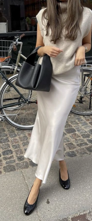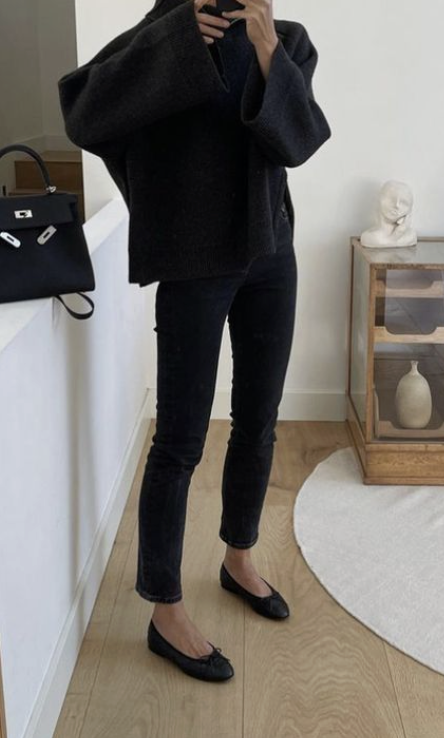 En hiver, la ballerine disparaît souvent au profit des boots. C’est dommage — parce qu’elle se porte très bien avec des collants opaques, une jupe mi-longue et un manteau structuré. Le contraste entre le froid de la saison et la légèreté de la chaussure crée quelque chose d’inattendu, d’un peu audacieux.