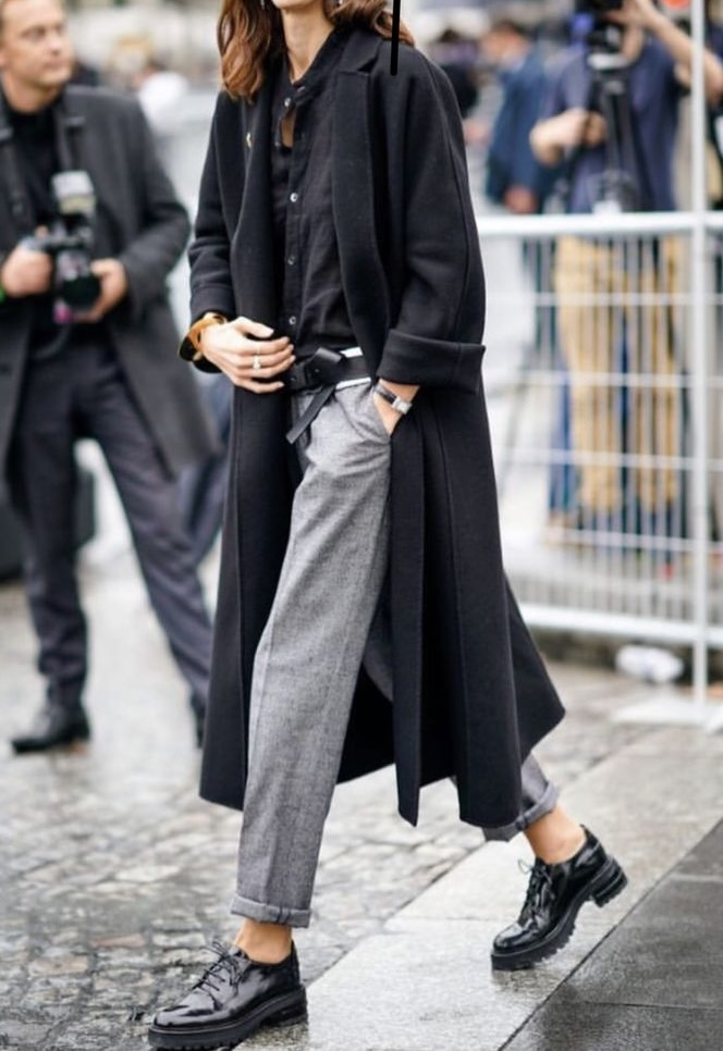 La derby a du volume au niveau du pied. Évitez donc de la porter avec un pantalon trop large ET trop long qui crée un effet « pyjama ». Préférez des coupes cigarette, slim ou des pantalons larges mais raccourcis à la cheville pour équilibrer la silhouette.