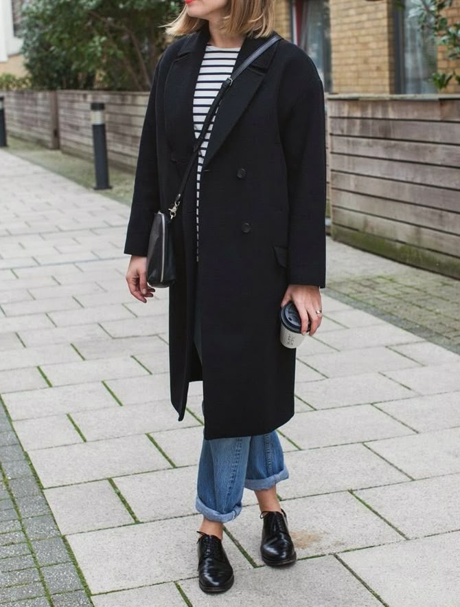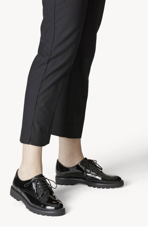 Associez-la à un long manteau noir, un jean droit gris et un pull en maille fine. Ajoutez un sac structuré et vous voilà prête à braver l’automne avec style. La derby vernie apporte cette touche de sophistication qui fait toute la différence, même sous la pluie battante.