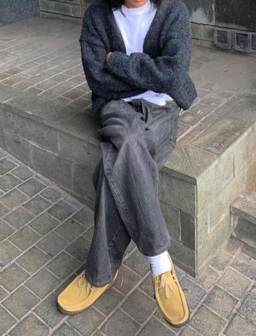 En haut, un t-shirt blanche oversize rentré à moitié ou un t-shirt graphique suffisent, avec un cardigan gris oversize ou pull cachemire ( un indémodable) . La derby claire adoucit l’ensemble et crée un contraste subtil avec des matières fluides. Parfait pour un brunch en terrasse ou une balade en ville.
