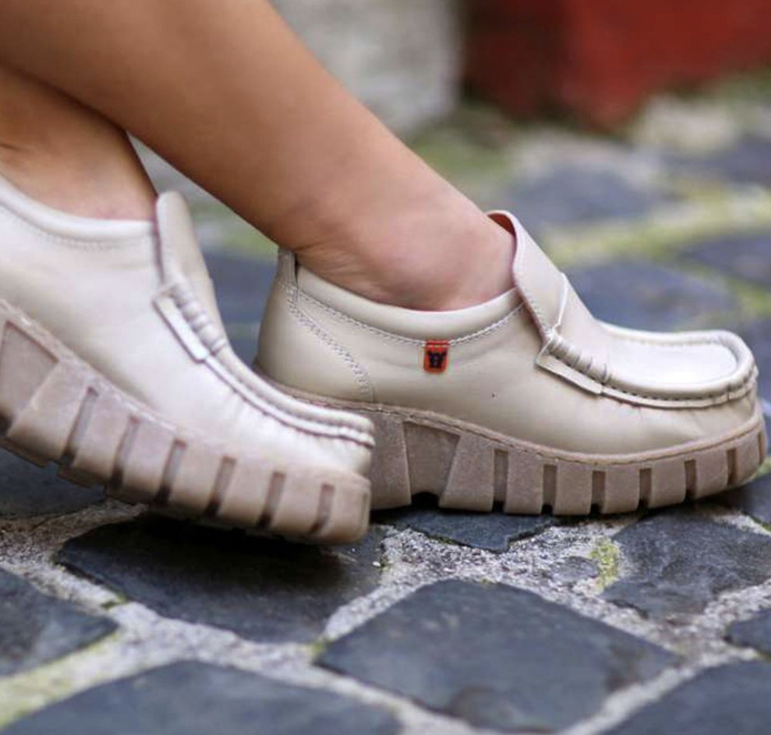 Ce modèle, c’est LE cracker des années 90 qui revient en force ! Avec sa semelle compensée à profil haut (5 cm) qui fonctionne comme un véritable trampoline, ces mocassins beiges offrent un style décontracté ultra tendance. Leur système d’élastique facilite l’enfilage et garantit un ajustement parfait.
