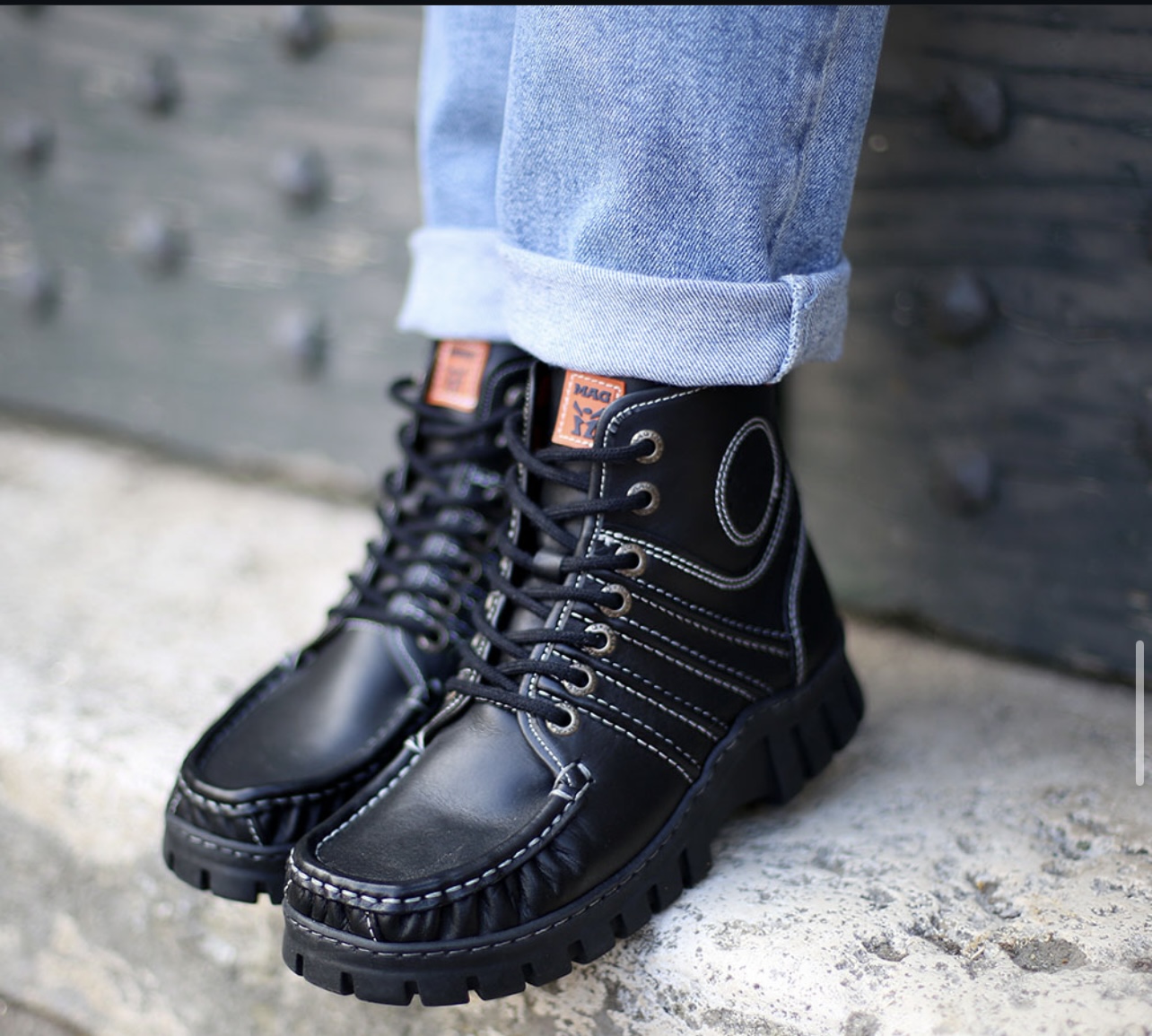 Ces bottines noires incarnent parfaitement l’esprit MAG. Avec leur look robuste et leurs détails sportifs, elles dégagent une attitude rock sans en faire des tonnes. Le cuir de qualité, la semelle plate de 3 cm et le système de laçage offrent un maintien impeccable.