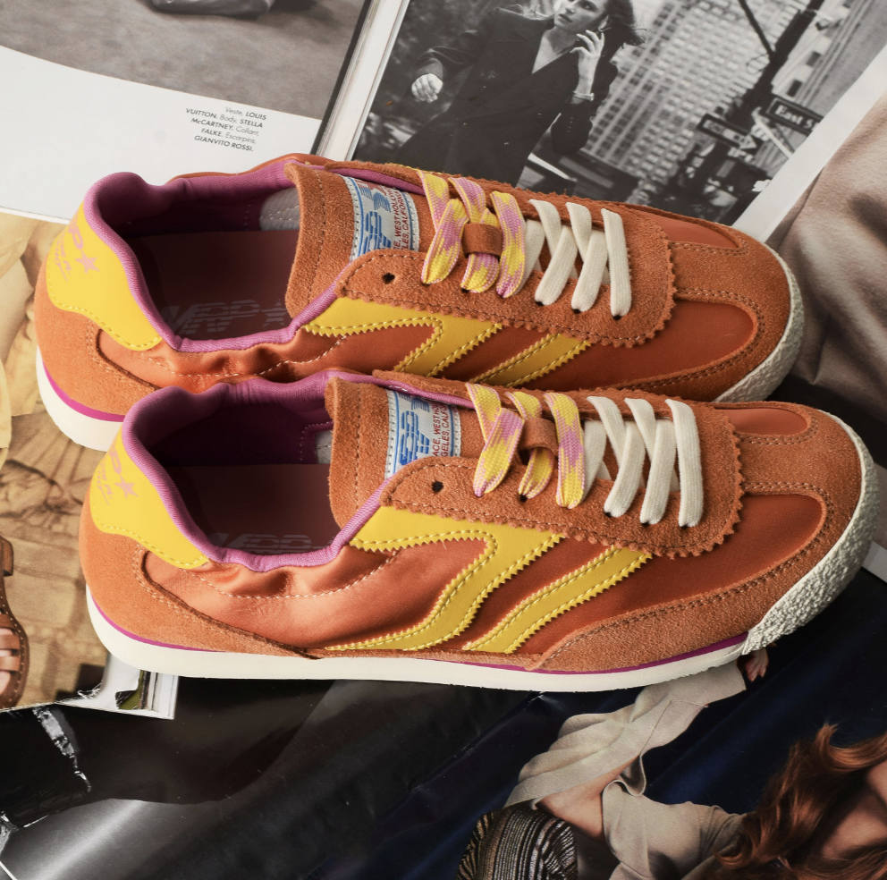 La Pure W orange/jaune/rose : la plus audacieuse du trio, et on assume totalement. Ce mélange d’orange brûlé, de jaune moutarde et de rose fuchsia, c’est un vrai condensé de bonne humeur. Chez Tendance Chaussures, on est convaincus que ces teintes chaudes et vitaminées apportent une énergie folle aux looks d’hiver. Le genre de basket qu’on enfile pour égayer les journées grises et affirmer son style sans complexe. Elle transforme littéralement une tenue neutre en statement look.